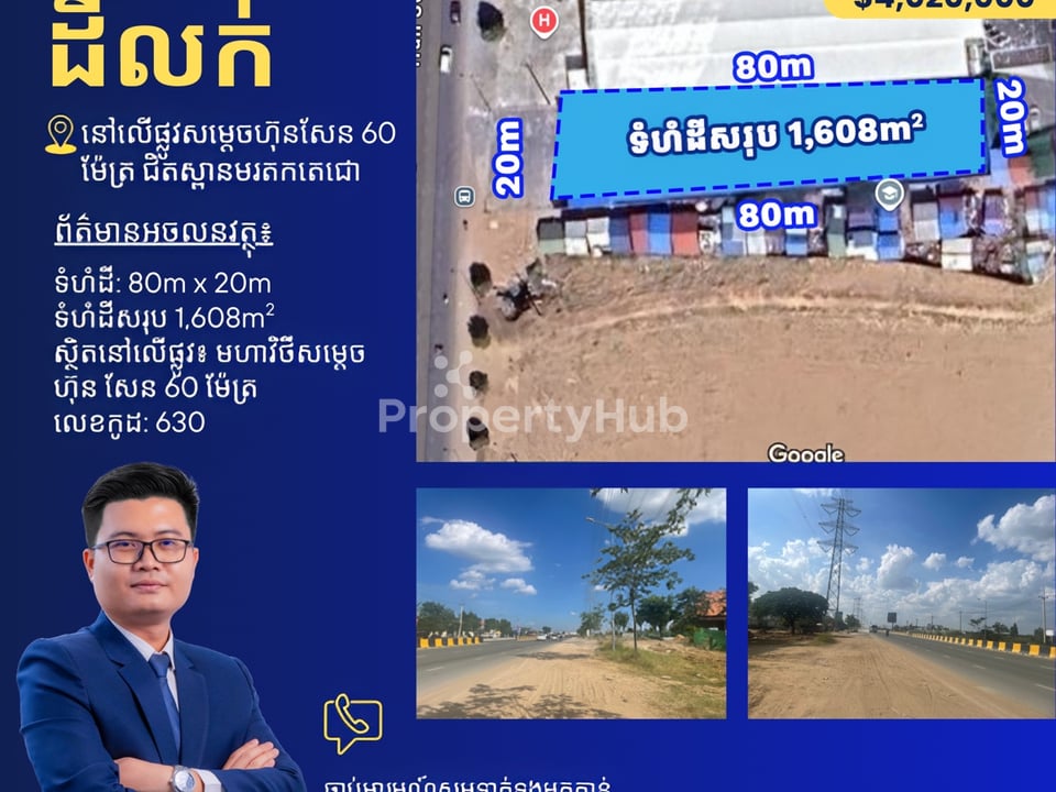 ដីសម្រាប់លក់ នៅលើផ្លូវសម្ដេចហ៊ុនសែន 60 ម៉ែត្រ