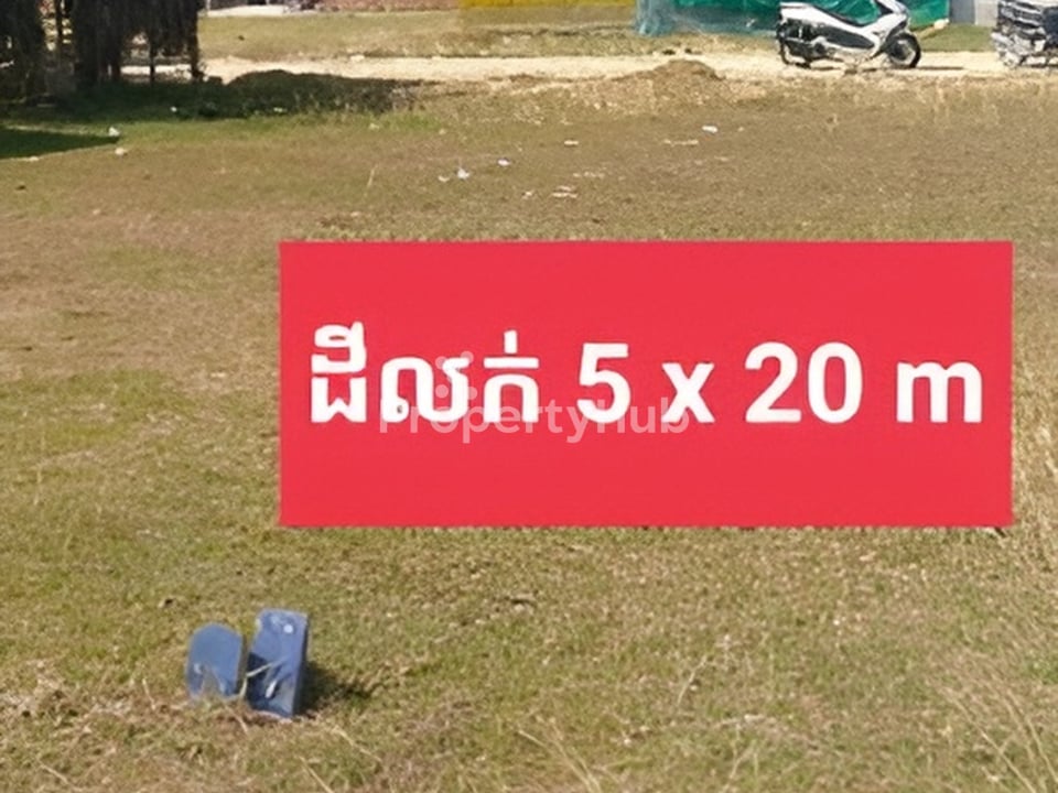 5ម x 20ម មានផ្លូវពីរ មុខផ្លូវរដ្ឋ 15m ក្រោយផ្លូវដីឡូត៍ 8m មានប្រពន្ធ័ទឹក ភ្លើងរដ្ឋស្រេច ជាប់ផ្ទះអ្នកស្រុក ចំងាយ 100m ពីផ្លូវបេតុងផ្សារត្រពាំង ថ្លាន់ ទៅពីភ្នំពេញ បត់ ស្តាំ