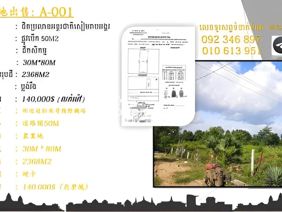 ដីលក់បន្ទាន់នៅក្នុងក្រុងសៀមរាប ដែលមានទីតាំងនៅចម្ងាយប្រមាណ500mពីផ្លូវក្រវ៉ាត់ក្រុ