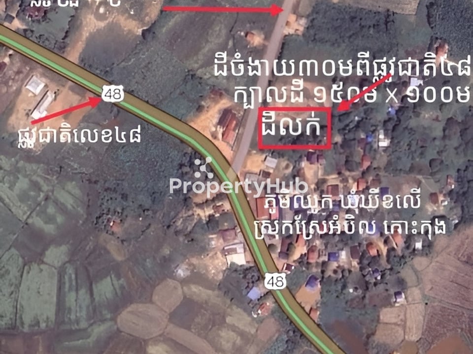 This road is directed to Chay Reap village, which is bordered to Pursath province, and it is connected to Thmor Baing district, Koh Kong province, and also to Oral district, Kampong Speu province. This land is in the serious developed area. Interested, call 078/069 80 37 38