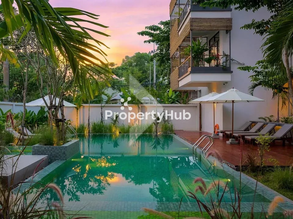Upon entering, you are greeted by a spacious living area elegantly furnished with contemporary décor and premium finishes. The open-plan layout seamlessly integrates the living room with a fully equipped kitchen. One of the highlights of this apartment is its access to a private pool, perfect for unwinding after a day of exploring Siem Reap's cultural treasures. Residents also enjoy exclusive access to a well-equipped fitness center, ensuring a balanced lifestyle.