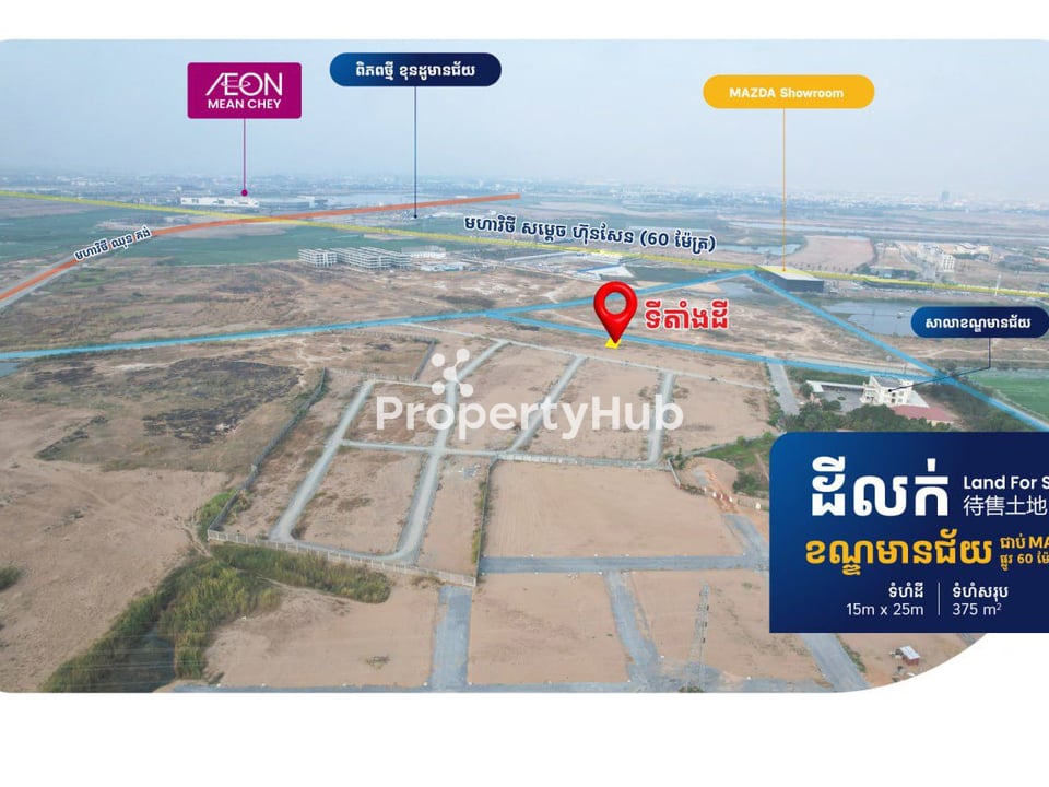 This prime residential land plot is ideally located just 3 minutes from AEON Mall Mean Chey and approximately 20 minutes from Techo International Airport, offering excellent accessibility and strong future growth potential in one of Phnom Penh’s rapidly developing areas. The land size measures 15m x 25m (375 sqm), providing the perfect dimensions to build your own dream home, a modern family villa, or a stylish residence tailored to your lifestyle. The property comes with a secure L-Map title, ensuring full legal ownership and peace of mind for the buyer.