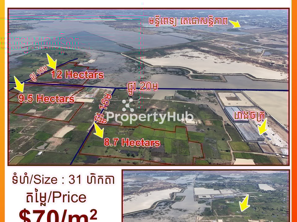✅ដីកែងលក់ តម្លៃក្រោមទីផ្សារ 📍ទីតាំង៖ នៅពន្សាំង លើផ្លូវ20ម កែងផ្លូវ 16ម ខាងលិច បឹងតាមោក (ជិតរោងចក្រ) 📐ទំហំសរុប៖ 310,492 ម៉ែត្រការ៉េ (31ហិកតា) 💵តម្លៃ៖ $70/ម៉ែត្រការ៉េ 🎯ទីតាំងល្អ សម្រាប់ ធ្វើឃ្លាំង រោងក្រ ឬ ទិញទុកចំណេញ, ស្ថិតក្នុងតំបន់អភិវឌ្ឍន បឹងតាមោក 📲ទំនាក់ទំនងពត៌មានបន្ថែម៖ 077975995 ————- ✅Land for SALE Urgent 📍Location : Songkat Ponsang, Khan Prek Phnov, Phnom Penh 📐Total size: 31 Hectars 💵Price : $70/m2 (Under Market Price) 🎯Good for build warehouse, factories 📲Contact for more info: 077975995 📍Location link: https://maps.app.goo.gl/eA7cS3mGgb2K1HC2A