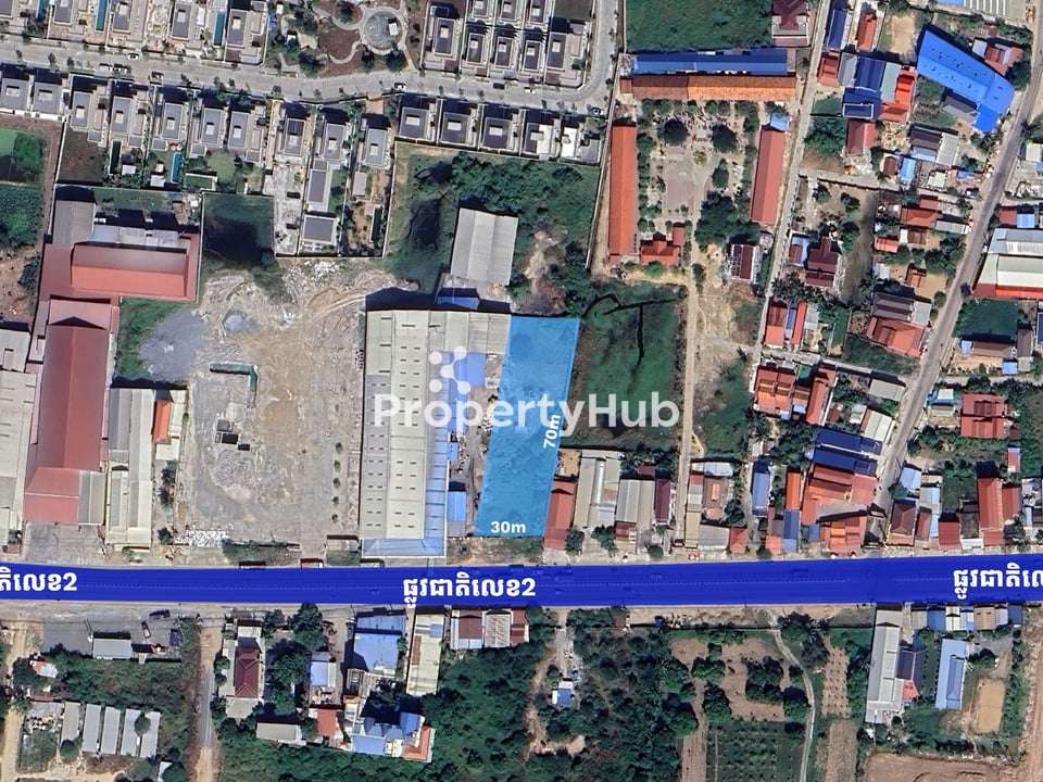 This 2,100 sqm land parcel with a 30m frontage and 70m depth is strategically located along National Road 2, one of Phnom Penh’s main arterial routes linking the city to the southern provinces. The area is active and well-established, surrounded by roadside businesses, residential communities, and growing commercial activity. The rectangular layout allows efficient land use with easy access directly from the main road.