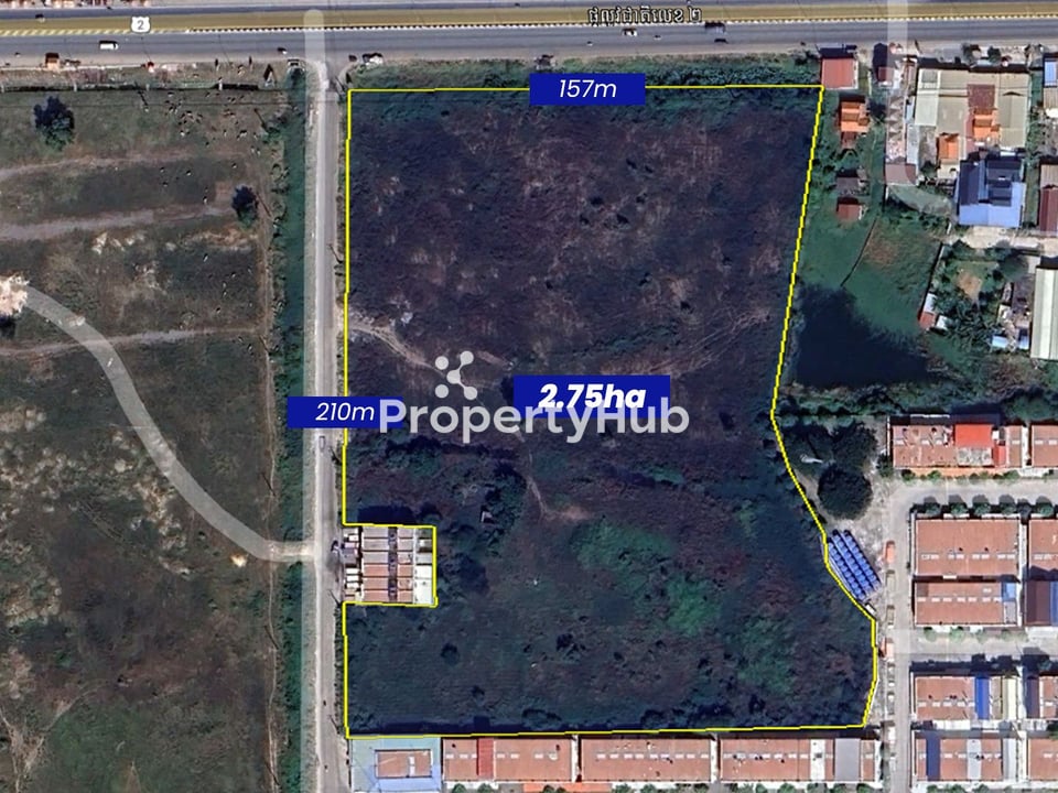 2.7 ha (27,000 m²) of land for sale along National Road 2 in Khan Dangkor. The parcel has a wide 157 m frontage on the main road, giving excellent visibility and direct access. It sits in a fast-growing development corridor with easy transportation links for trucks and staff. The shape and frontage make it practical for large-scale layouts and multiple access points.