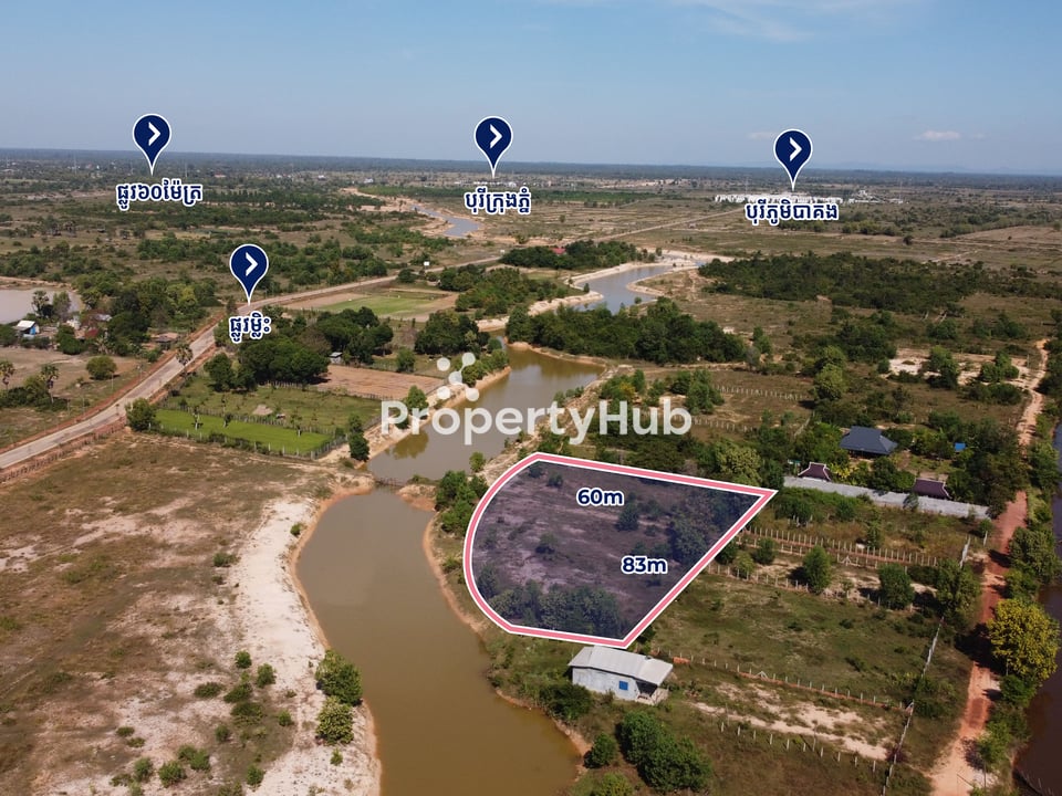 The land covers a total area of 3,099 sqm and sits right next to the river, offering a peaceful natural setting. It is surrounded by residential houses, holiday villas, and the well-known Borey project Bakong Village. It is also close to the planned 60m road, making it ideal for private living, a holiday home, or a future investment.