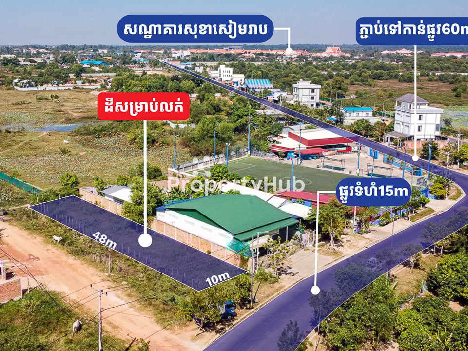 Land for sale located in Sla Kram Commune, Siem Reap City, positioned on a main road connecting National Road 6 (Chung Kavsu traffic light) to the 60m road. The total land area is 487 sqm with dimensions of 10m x 48m. This corner plot offers excellent potential for various uses due to its prime location and accessibility.
