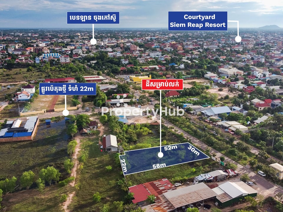 This land for sale comes with a hard title and has a total size of 1,666 sqm (30m x 58m). It is located on the main road connecting the Chung Kavsu Traffic Light to Apsara Road (60m Road), in Tlok Andoung Village, Sla Kram Commune, Siem Reap City, just 4 km from the Royal Residence of Siem Reap. With this prime and convenient location, the land is ideal for opening any type of business, such as big retail, showroom, supermarket, warehouse, or other commercial developments. It offers strong potential for investors looking for a strategic property in a fast-growing area.