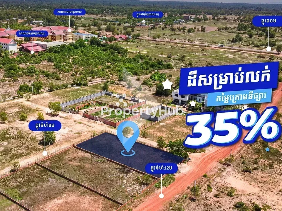 plot of land for sale near 60m Road in Siem Reap City, located in a rapidly developing area. The land features a 12m access road and is situated close to the Borey Administration of Siem Reap Province.