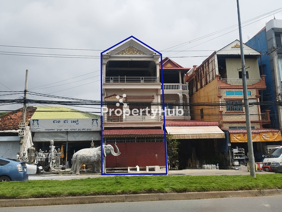 Shophouse for rent along National Road 1 in a crowded, high-traffic area. The unit is spacious with a wide street frontage and clear visibility from the main road. It sits where many people pass by on foot and in vehicles. The layout is flexible and can be adapted for retail, services, or an office. Rent is affordable for the location.