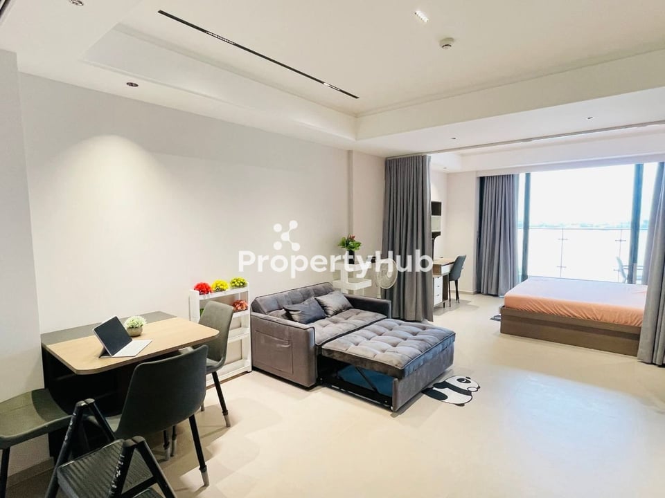 Discover the perfect blend of modern living and serene views with this stunning Studio room -style condo at La Vista One. Designed for those who value space and sophistication, the layout boasts elevated ceilings and an open design that creates a luxurious and airy ambiance. Fully furnished with premium-quality furniture and appliances, this home is move-in ready, offering convenience and style. Best of all, the unit features breathtaking river views, providing a tranquil and scenic backdrop to your daily life.