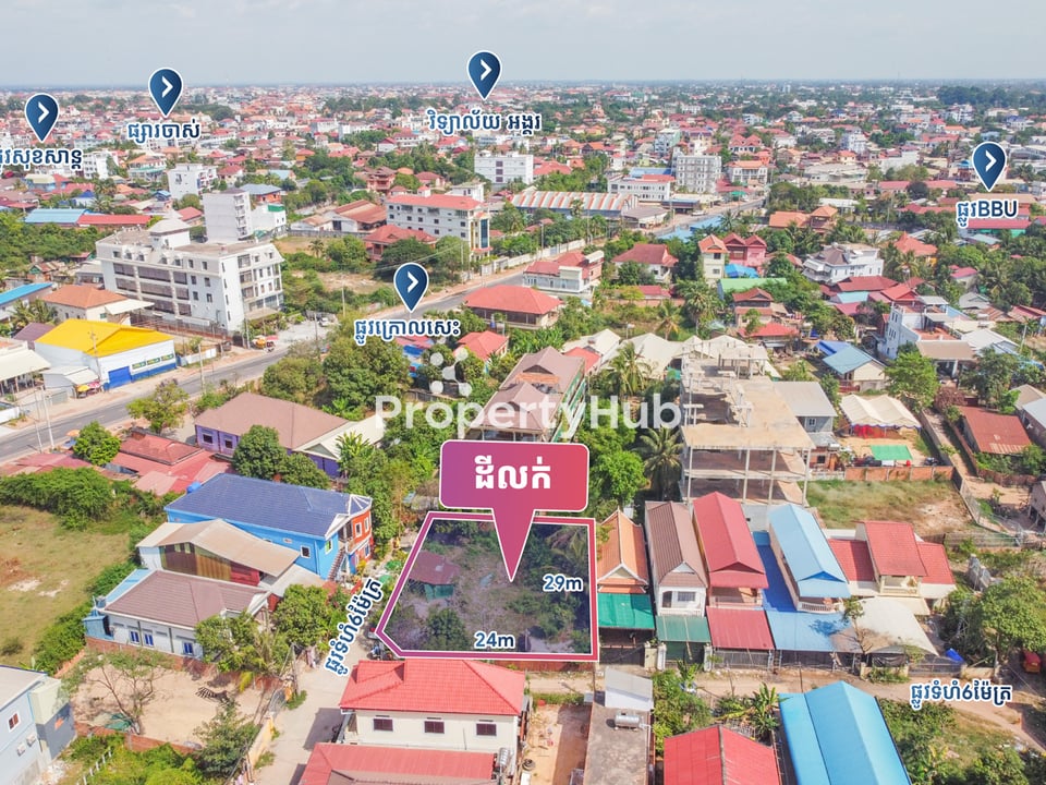 A 726 square meter plot of land is available for sale in Svay Dangkum Commune, Siem Reap. Located just a 5-minute drive from the city center, this property offers excellent potential for residential or holiday home. Its convenient location provides easy access to markets, schools. With its strategic position in a rapidly growing area, this land presents a valuable investment opportunity for future growth and development.