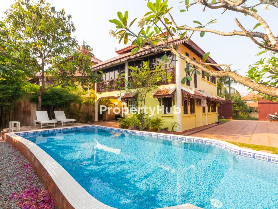 This beautiful 3-bedroom Khmer-style villa with a private pool is available for rent in the peaceful Svay Dangkum area of Siem Reap. Blending traditional Khmer architecture with modern comforts, this fully furnished home features spacious bedrooms, an open living and dining area, and a well-equipped kitchen. The villa boasts a private swimming pool and a large garden, creating a serene retreat while still being just 5-10 minutes from Pub Street and the Night Market. With secure parking and easy access to schools, supermarkets, and restaurants, this villa is perfect for families or long-term residents seeking a tranquil yet convenient lifestyle. Contact us today for more details or to schedule a viewing.