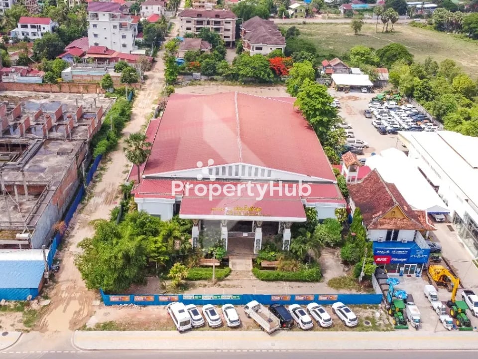 For rent is a commercial space located on National Road 06 in the Svay Dankum area of Siem Reap. The property features 5,825 square meters of land and a building size of 2,880 square meters. Its prime location offers great visibility and easy access, making it perfect for shops, restaurants, or offices. This is a fantastic opportunity for businesses looking to thrive in a busy area with lots of foot traffic.