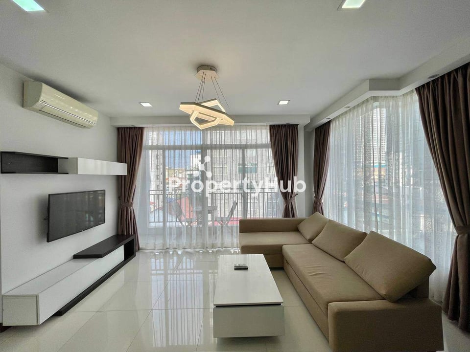 This well-designed two-bedroom apartment offers generous living space and comfort, with a total size of 128 sqm and a rental price of $1,200 per month. The unit features 2 bathrooms, a bright living room, a separate study room, a fully equipped kitchen, and two balconies that provide good airflow and natural light. It is fitted with three air-conditioning units and a washing machine, making it ideal for comfortable everyday living.