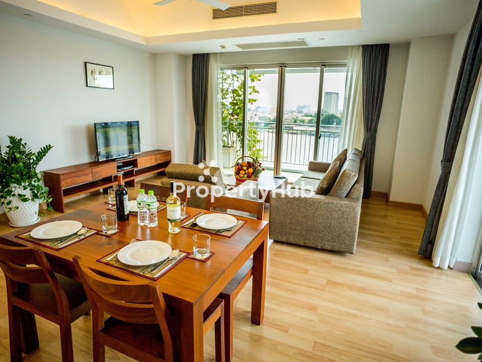 Experience premium riverfront living in this spacious 1-bedroom apartment spanning 95sqm, perfectly located in the serene Chroy Changvar area. The unit boasts a private balcony with breathtaking views of the Tonle Sap River, Mekong River, and the city skyline — offering a peaceful retreat just minutes from the city center. With its open layout and high-end finishes, this apartment is ideal for individuals or couples seeking both comfort and style.