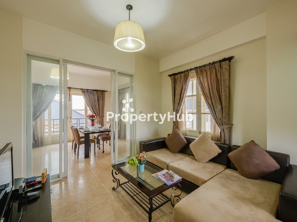 The apartment comes with complete furniture in both bedrooms and the living room, a fully equipped kitchenette and cooking ware set, a flat-screen TV with premium cable channels, a refrigerator, washing machine, and a safety box for added security.
