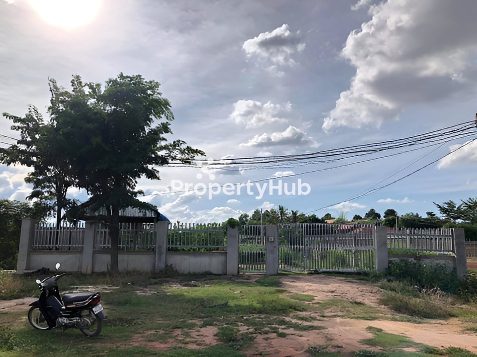 “ដីលក់” ដីចាក់ខ្ពស់ស្រាប់ មានរបងថ្មជុំវិញ លក្ខខណៈពិសេស ដីកែងផ្លូវរដ្ឋមុខដី 22ម៉ែត្រ និងផ្លូវជំហៀង15ម៉ែត្រ ក្នុងក្រុងសៀមរាប ។