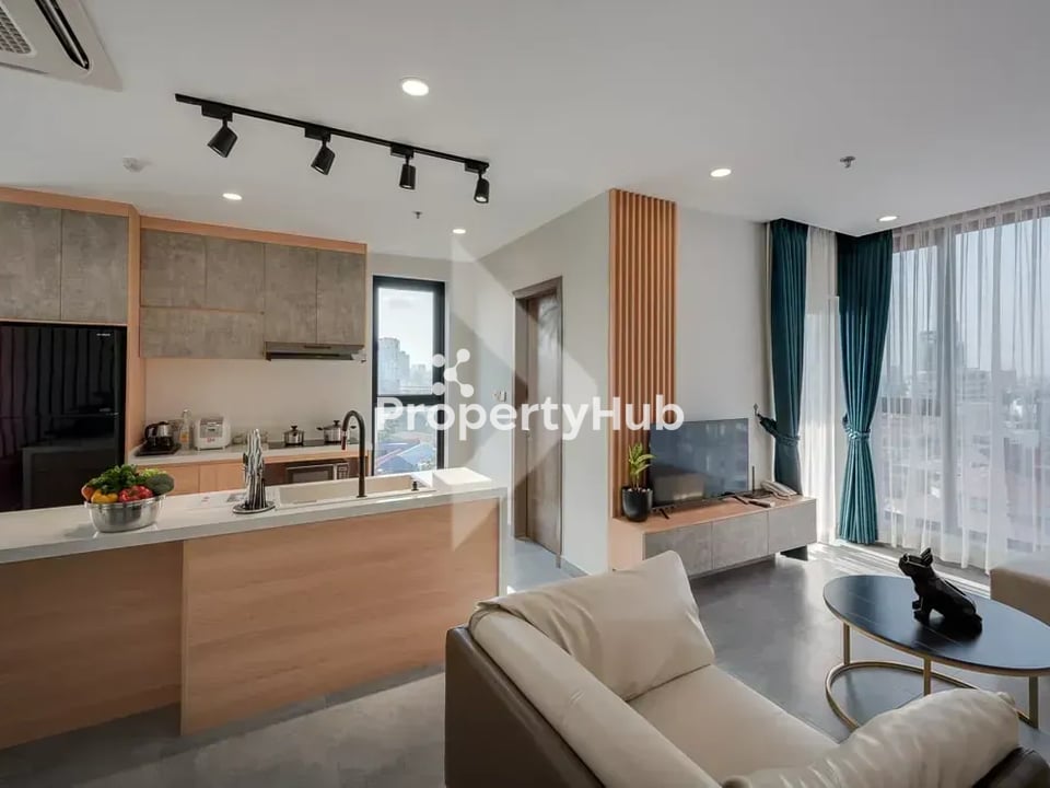 This fully furnished two-bedroom apartment offers 24/7 security, a kitchen, bathroom, weekly cleaning and linen changes, high-speed internet, cable TV with a smart TV, and city water supply. The apartment includes a fully equipped kitchenette, refrigerator, and microwave. Residents enjoy access to a 24/7 receptionist and security guard, as well as a backup generator. Building amenities include a swimming pool, gym, and steam and sauna rooms, all available for free use.