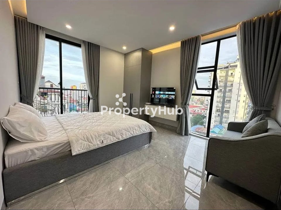 This stylish studio apartment in Toul Tompong offers 32 sqm of bright and well-designed living space. The unit is fully furnished with a comfortable bed, sofa, smart TV, and built-in wardrobe, complemented by large windows that provide plenty of natural light and city views.