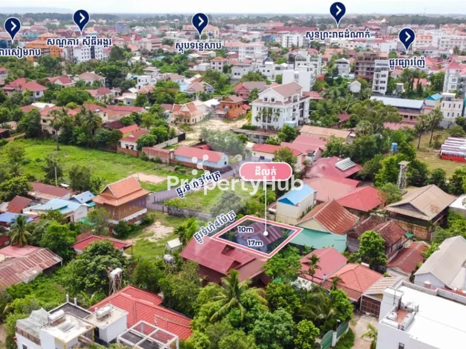 A 185 sqm plot of land in the Svay Dankum area of Siem Reap, measuring 10m by 17m. This land is perfect for building a private villa. It’s located in a lively neighborhood with easy access to shops, mini mart, markets, and schools, making it a great spot for families and entrepreneurs. The area is growing, offering plenty of potential for investment. Don’t miss this chance to own a piece of land in a popular part of Siem Reap.